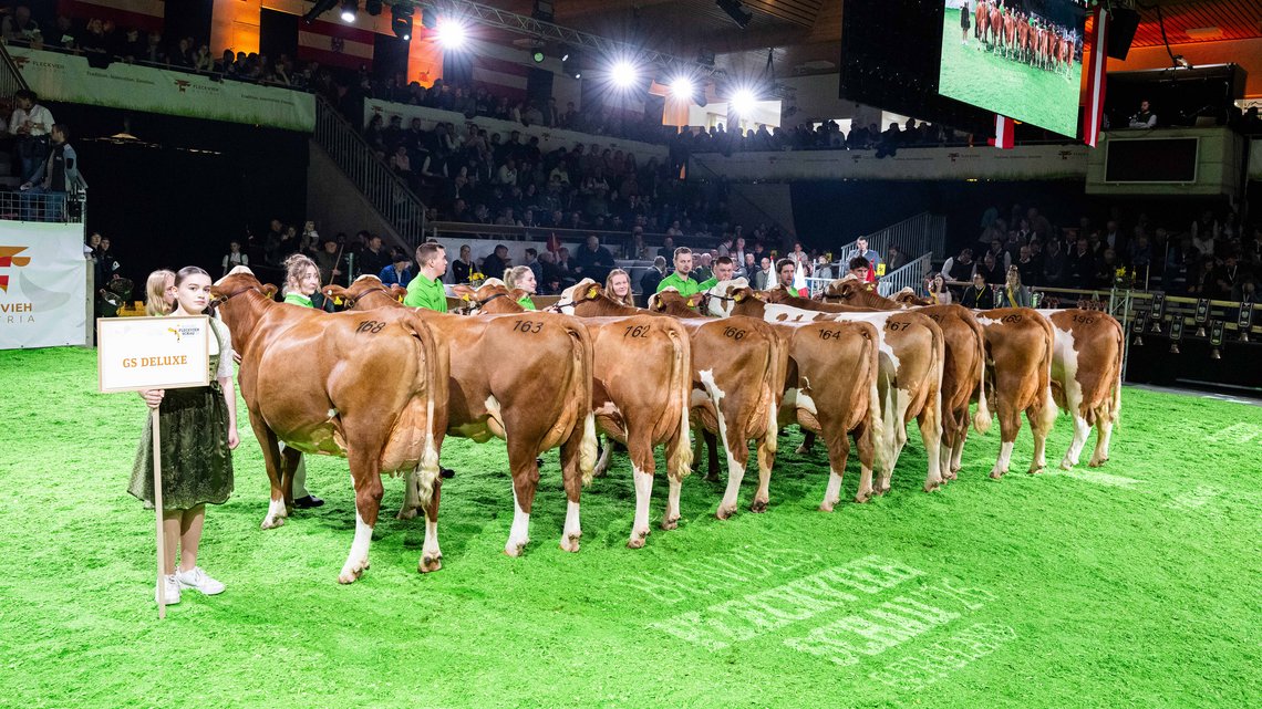 GS DELUXE ist aktuell mit einem Milchwert von 131 in diesem Merkmal der beste Töchter-geprüfte Stier. Die neun GS DELUXE-Töchter bestätigten die Zuchtwerte ihres Vaters sehr gut. Die Kühe zeigten viel Größe, Breite, Länge und Tiefe mit tendenziell ebeneren Becken und guten Fundamenten. Im Euterbereich bestätigten die Kühe eine gute Voreuterlänge und -Aufhängung. Die sehr elegante GS DELUXE-Tochter LILLYFEE vom Betrieb Elisabeth und Anton Milchrahm konnte im Schaubewerb mit ihren Stärken im Fundament und Euter eine Klasse für sich entscheiden. Die GS DELUXE-Tochter ROSANNA von Franz Auer, Tirol, holte sich den Reservechampion-Titel bei den Jungkühen und unterstrich damit die Stärken ihres Vaters.