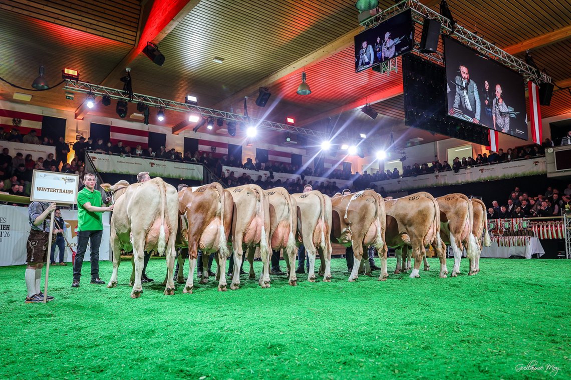Neun typische WINTERTRAUM-Töchter aus Niederösterreich und der Steiermark zeigten mit einem sehr einheitlichen Schaubild die Vererbungsstärken ihres Vaters. Die Kühe hatten ein sehr feines und korrektes Skelett mit genügend breiten, sehr gut gelagerten Becken. Die Euter waren lang, gut aufgehängt, die Strichen waren sehr gut platziert. Mit ideal gewinkelten Hinterbeinen, extrem trockenen Sprunggelenken, sicherer Fessel und hohen Trachten unterstrichen die WINTERTRAUM-Töchter die große Vererbungsstärke ihres Vaters. Mit einem Fundamentzuchtwert von 138 ist er der aktuell beste Fundamentvererber der Fleckviehpopulation. Eine weitere große Stärke von WINTERTRAUM ist sein hoch positiver Einfluss auf die Fitnessmerkmale Eutergesundheit, weibliche Fruchtbarkeit, Kalbeverlauf und Klauengesundheit. Aus der Nachzuchtkollektion konnten sich die Jungkuh LOCKE von Heindl Regina und Michael, NÖ, sowie die Zweitkalbskuh ELLI von Prügger Monika und Georg, Passail, auch im Schaubewerb an Spitzenplätzen platzieren.
