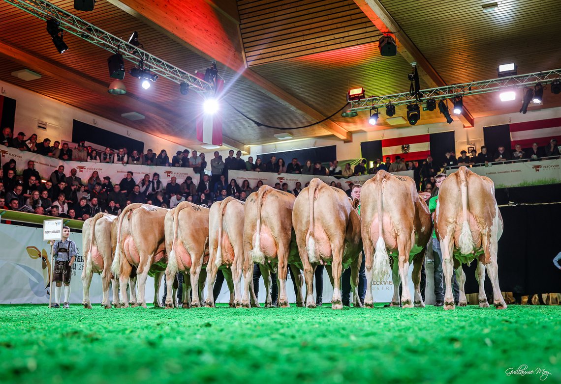 Ein bisher noch nie erreichtes Qualitätsniveau fand sich in den beiden Klassen der Viertkalbskühe. In der ersten der beiden Klassen gab es einen fulminanten Doppelsieg für die Steiermark. Der Sieg ging an die HELSINKI-Tochter KITTY von Johannes Bauer, Ratten. KITTY war mit ihrer Kombination aus extrem hohem und breit angesetztem Euter mit bester Voreuterqualität und optimalem Fundament gepaart mit einwandfreien Verbindungen nicht zu schlagen. Sie siegte vor der MERCEDES-Tochter LARA von Anna und Christoph Eichberger, Knittelfeld, die mit ihrem Paket aus idealem Fundament und Spitzeneuter ebenso zu den Ausnahmekühen zählte. In der zweiten Gruppe der Viertkalbskühe konnten sich Anna und Christoph Eichberger noch einmal einen Reservesieg mit der MANAUS-Tochter LAETICIA sichern. LAETICIA zählte mit einem außergewöhnlich hoch sitzenden und langen Euter gepaart mit idealen trockenen Fundamenten zu den Zuckerln der Schau.