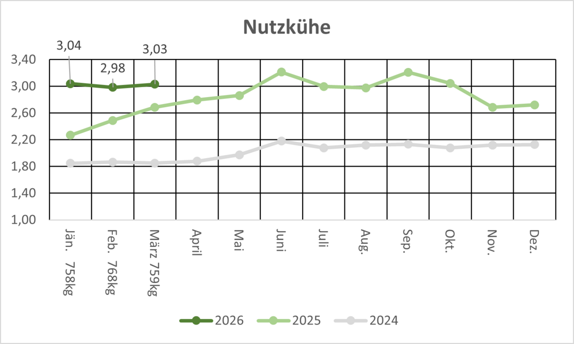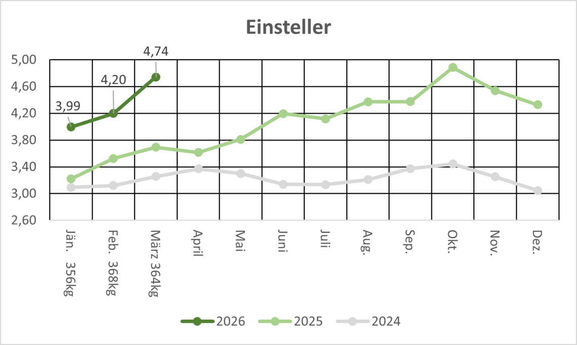 Sehr gut nachgefragt waren auch die Einstellstiere, für Fleischrassekreuzungen lag der Durchschnittspreis bei 330 kg Durchschnittsgewicht erstmals über 5 € netto. Die Einstellkalbinnen behaupten sich schon seit dem Herbst auf hohem Niveau, mit 4,71 € im Durchschnitt legten die hohen Preise noch weiter zu.